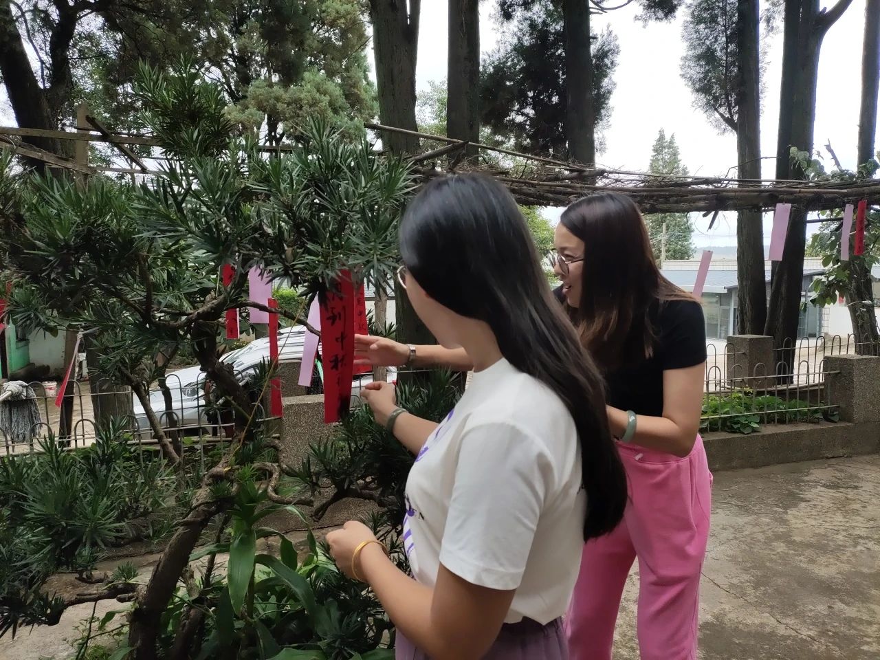 桂花樹下,羅漢松前,桂香謎馥,一個個迷語條掛在枝頭隨風(fēng)搖曳,大家被融知識性、趣味性為一體的謎語所吸引,紛紛思考,認(rèn)真琢磨。