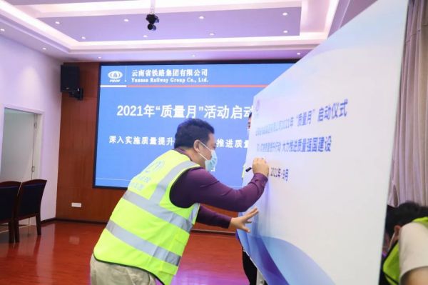 啟動儀式現(xiàn)場,云鐵集團黨委副書記、董事長童秀東鄭重宣布活動啟動。隨后,公司領(lǐng)導(dǎo)班子成員帶頭,干部職工依次在“質(zhì)量月”活動主題板簽名。