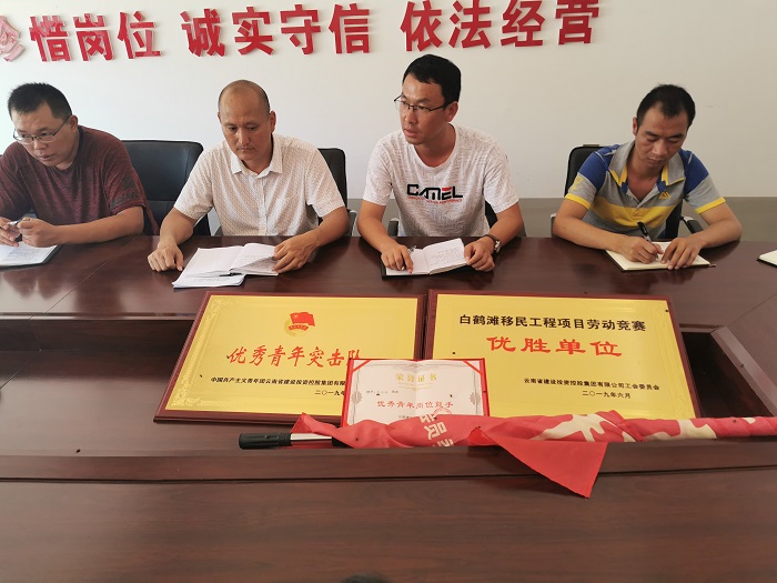 7月17日,集團(tuán)公司工會常務(wù)副主席楊金到巧家白鶴灘水電站移民工程指揮部開展“送清涼” 慰問活動,并對前期開展的白鶴灘移民工程場平施工勞動競賽、青年突擊隊競賽進(jìn)行表彰。云南省鐵路總公司金塘安置點場平項目表現(xiàn)突出、成績優(yōu)異,青春先鋒青年突擊隊榮獲集團(tuán)“優(yōu)秀青年突擊隊”,項目部榮獲“白鶴灘移民工程項目勞動競賽優(yōu)勝單位”、“工人先鋒號”,共三個集體獎項,趙向坤獲得了“優(yōu)秀青年崗位能手” 個人獎項。